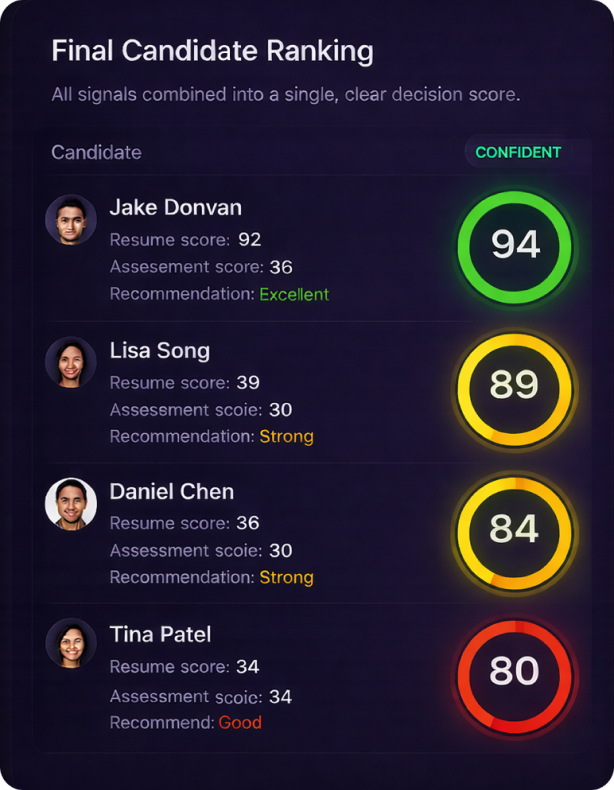 Smart final rankings combine resume analysis, skill validation, and AI interview performance into one comprehensive score
